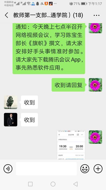 日前,教育部长陈宝生在《旗帜》杂志发表了题为《深入学习贯彻习近平总书记关于教育的重要论述》文章,系统总结习近平总书记关于教育的重要论述的科学内涵和精神实质,对今后教育工作做出了顶层设计,绘就了发展蓝图。鉴于目前抗击疫情的特殊时期,各党支部决定以视频会议的形式开展学习。教师第一党支部、教师第二党支部利用腾讯会议平台,学生党支部教师党员利用微信群分别召开视频会议,组织教师党员系统学习了陈部长文章精神。会上,党员们结合本职岗位,围绕习总书记关于教育的论述和陈部长的文章内容分享交流了自己的学习成果。
