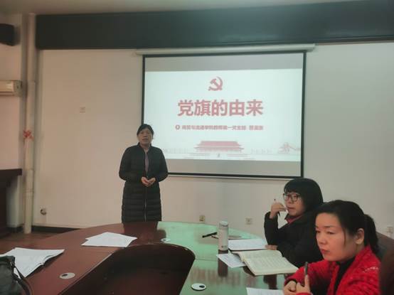 11月25日,在崇文楼五楼商贸与流通学院会议室,支部书记晋淑惠以《党旗的由来》为题给全体教师党员上了一堂生动、详实的党课。晋书记围绕党旗的由来,以党的时间线为主轴,通过讲述党的一大、党的二大、秋收起义、党的七大等历史重大事件,详细介绍党旗从无到有,样式规格、不断优化设计,到最终的明确规定。展示了中国共产党以民族解放和实现中华民族伟大复兴为己任,揭示“没有共产党就没有新中国”这一真理。