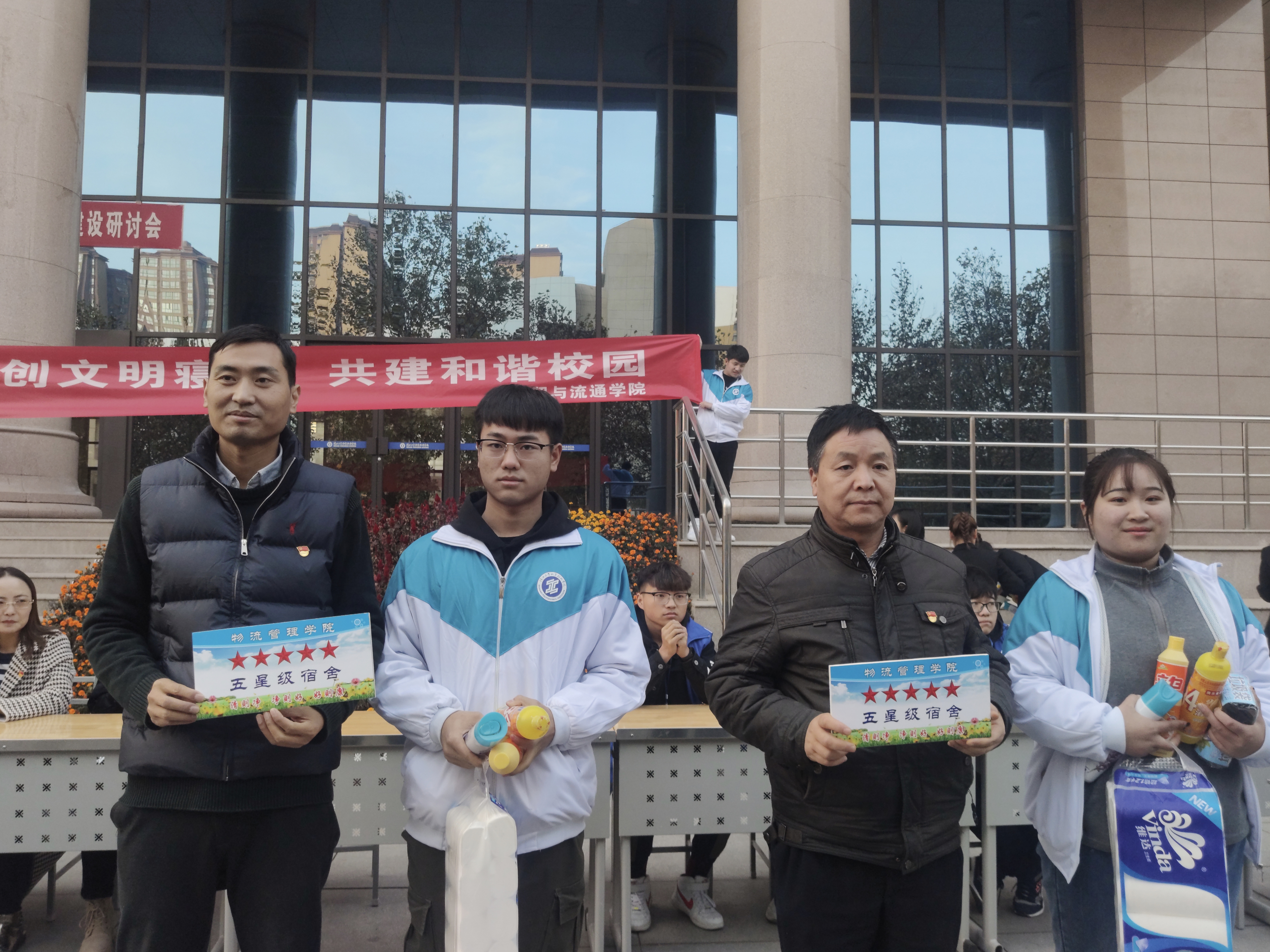 为创造整洁、文明、温馨的宿舍环境,树立文明新风,12月5日下午,商贸与流通学院在精艺楼前举办“争创文明宿舍,共建和谐校园”主题教育活动暨优秀宿舍表彰大会。学工办主任成志平、全体辅导员,以及2018级、2019级各班生活委员、舍长共同参加活动。