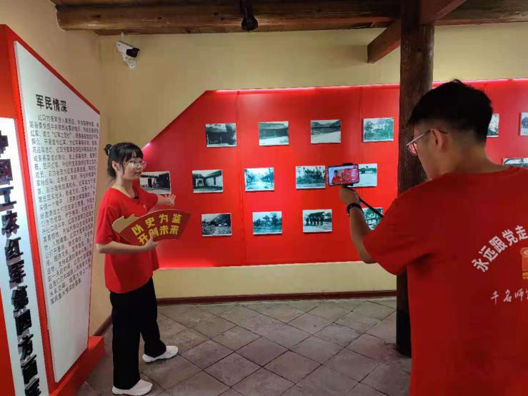 开展特色活动。7月28日,实践团走进中国工农红军第四方面军小河口会议纪念馆。小河口会议是红四军在在生死存亡关头召开的重大转折性会议,是我党善于开展批评与自我批评,积极修正和改善错误的生动实例。在纪念馆学生第一党支部以线上线下相结合的形式举行“学革命史,走强国路”主题党日活动。实践团临时党小组四位党员在展馆内重温了入党誓词。队员郭瑞妮同学以在线直播的形式,带领支部党员参观城固小河口会议纪念馆,支部党员在线交流了学习体会。在小河镇实践团还来到小河敬老院开展志愿活动。                     图为当日宣讲成员在小河口会议纪念馆进行线上宣讲活动