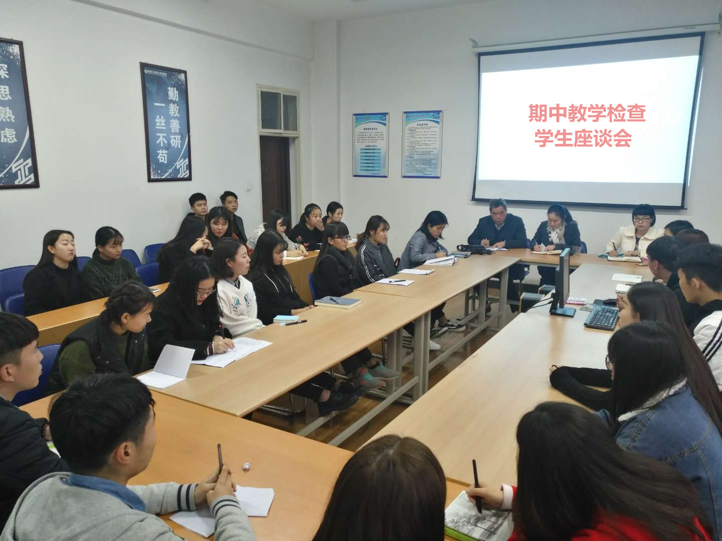 本此期中教学检查分别以几个阶段进行。第一阶段,各教研室分别从教研活动记录、教案、授课计划、顶岗实习、试卷、实训运行记录、校内外实训情况及实训指导书、多媒体授课等方面进行全方位自查。第二阶段,11月6日下午,物流管理学院对全体专兼职教师的教案和信息化教学设计进行展出并集中评议,最终联评推出优秀教案6本、信息化教学设计15门。第三阶段,11月8日下午,物流管理学院召开教师座谈会,物流学院领导及全体教师参加了会议。与会教师就教学环节、教学方法学生管理及设施保障等方面畅所欲言,提出了意见与建议。9日下午,组织在校学生参加座谈会,学生代表们踊跃发言,提出生活、学习中遇到的各类问题,并对学院发展献言献策,尤其是同学们认为王霄老师上课与学生互动多,教学手段多样化,晚自习辅导认真负责,很喜欢她的授课。