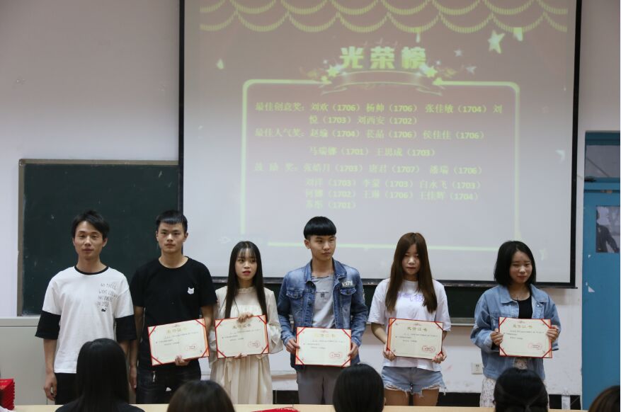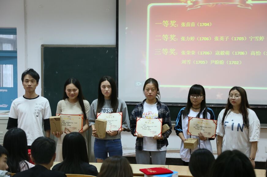 李蒙(1703)白永飞(1703)何娜(1702)王琳(1706)苏彤(1701)在颁奖仪式上为获奖同学颁发证书以及奖励。