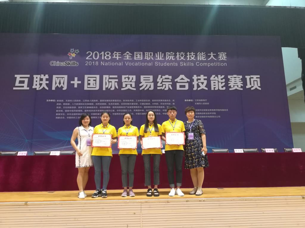 5月27日,2018年全国职业院校技能大赛“互联网+国际贸易综合技能”赛项(高职组)在无锡商业职业技术学院落下帷幕。经过两天的激烈角逐,最终由我院物流管理学院王粉萍、杨华老师指导,市场营销1602班潘成杰、任凯悦、商务英语1601班程锦锦、商务英语1602班邱怀露4名同学组成的代表队斩获团体三等奖。