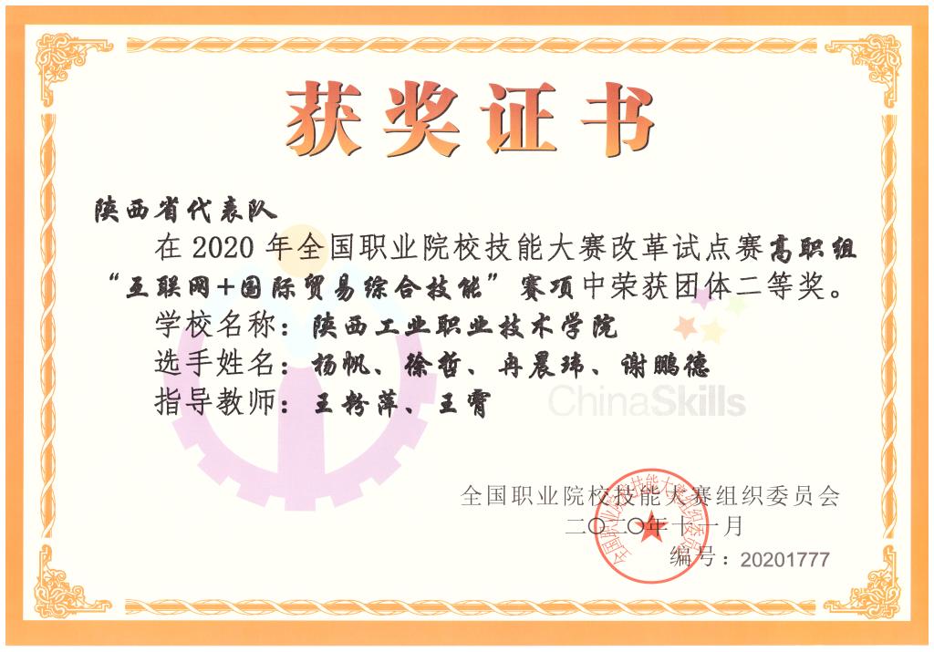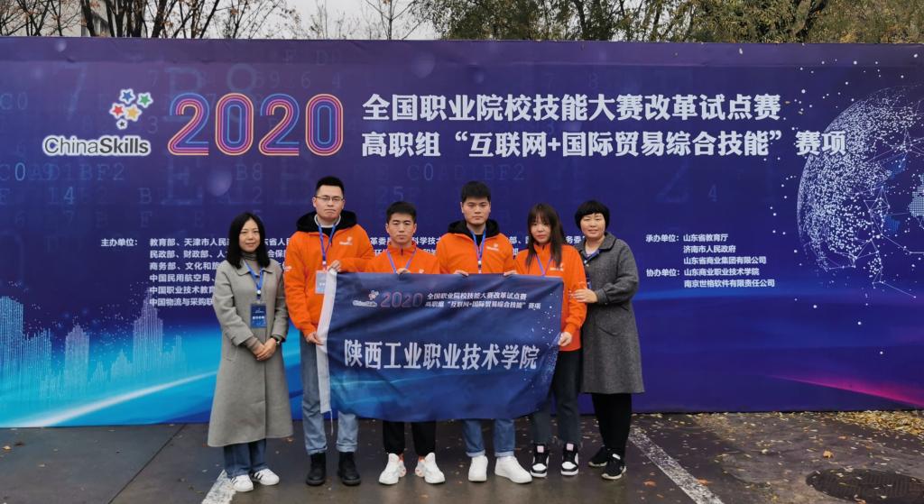 11月17日-18日,2020年全国职业院校技能大赛改革试点赛高职组“互联网+国际贸易综合技能”赛项在山东商业职业技术学院举行,来自全国29个省市自治区的29支代表队参加本次比赛,由商贸与流通学院王粉萍、王霄两位老师指导的杨帆、徐哲、谢鹏德和冉晨玮四位同学组成的代表队代表陕西省参赛。经过两天的激烈角逐,最终以总分第四名的成绩荣获国赛团体二等奖。
