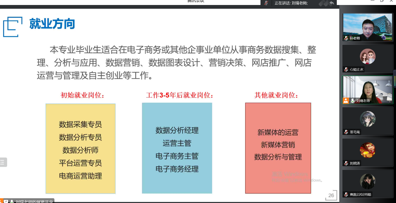 9月29日晚,我院商务数据分析与应用专业利用腾讯会议在线上召开了2022级新生专业介绍讲座,孙菲、刘瑞、李婷、帅珍珍、李倩等老师及商数22级全体新生参加了会议,会议由刘瑞老师主持。