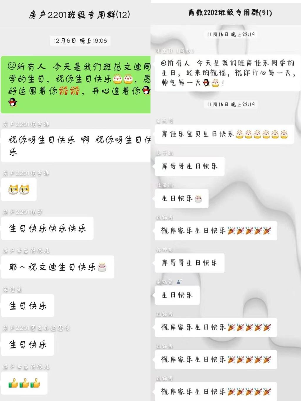 为增强学院学生归属感和幸福感,进一步提升班级凝聚力,营造温馨、团结的班级氛围,我院在所有班级内推行“生日提醒”活动。班干部提前了解清楚每一位学生的生日,并于生日当天在班级群发送生日提醒,鼓励全班同学献上生日祝福。
