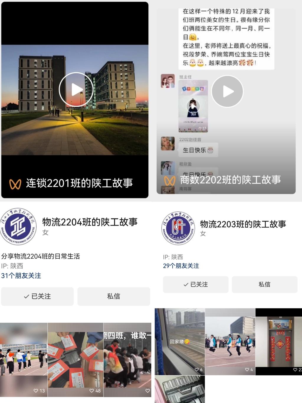 为进一步创建优良班风,切实增强班级凝聚力、向心力。我院2022级16个班全部开通了微信视频号,视频号由各班学生干部管理和运营,班主任负责把关和审核,班级所有同学都可以积极投稿,包括宿舍日常生活记录、自导自演短剧、班级集体活动剪影等,以丰富多彩的形式传递班级正能量,讲述各班级的陕工故事。