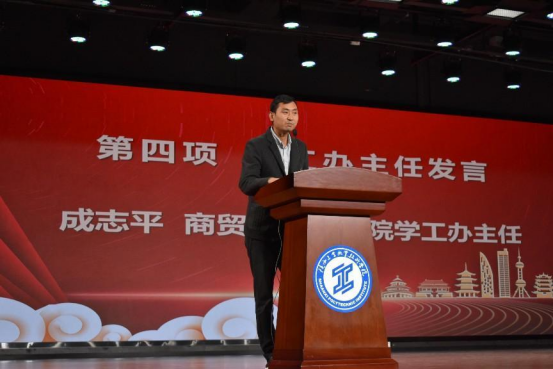 随后,商贸与流通学院学工办主任成志平老师发言,提出今年商贸与流通学院对专升本班的各项要求,并对专升本班的同学们提出了要求,要求专升本班同学对于学习有信心、能专心、持志恒心、要静心,希望同学们戒骄戒躁,严格要求自己。