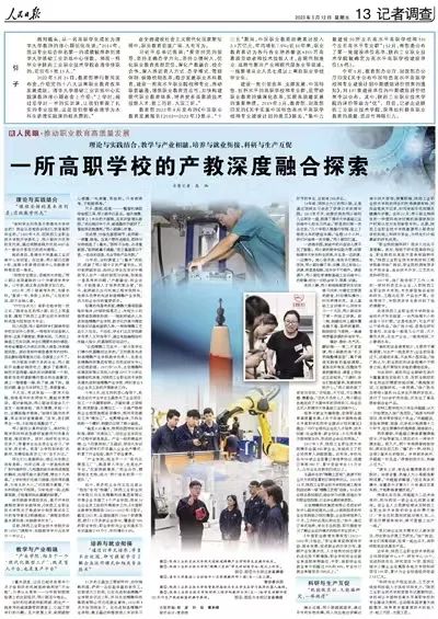 5月12日,《人民日报》13版以《理论与实践结合,教学与产业相融,培养与就业衔接,科研与生产互促—一所高职院校的产教融合深度探索》为题,报道我校主动适应职业教育新业态、新常态,探索“四位一体”育人新模式,全方位提升职业教育的适应性、吸引力,为学生搭建出彩人生舞台的办学成效。