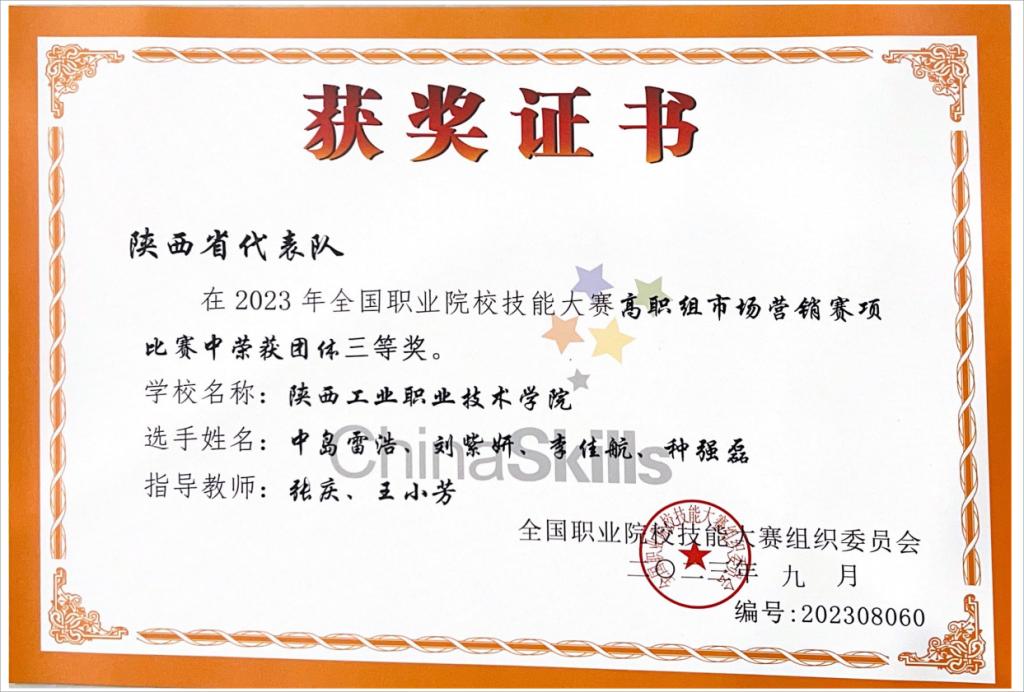 2023年9月14日,全国职业院校技能大赛市场营销赛项在甘肃省兰州市圆满落幕。全国62支参赛队伍,120余名参赛选手围绕数字营销、营销策划、情景营销三个模块展开激烈角逐。最终,我院由种强磊、李佳航、中岛雷浩、刘紫妍四位学生组成的团队脱颖而出,荣获团体三等奖。
