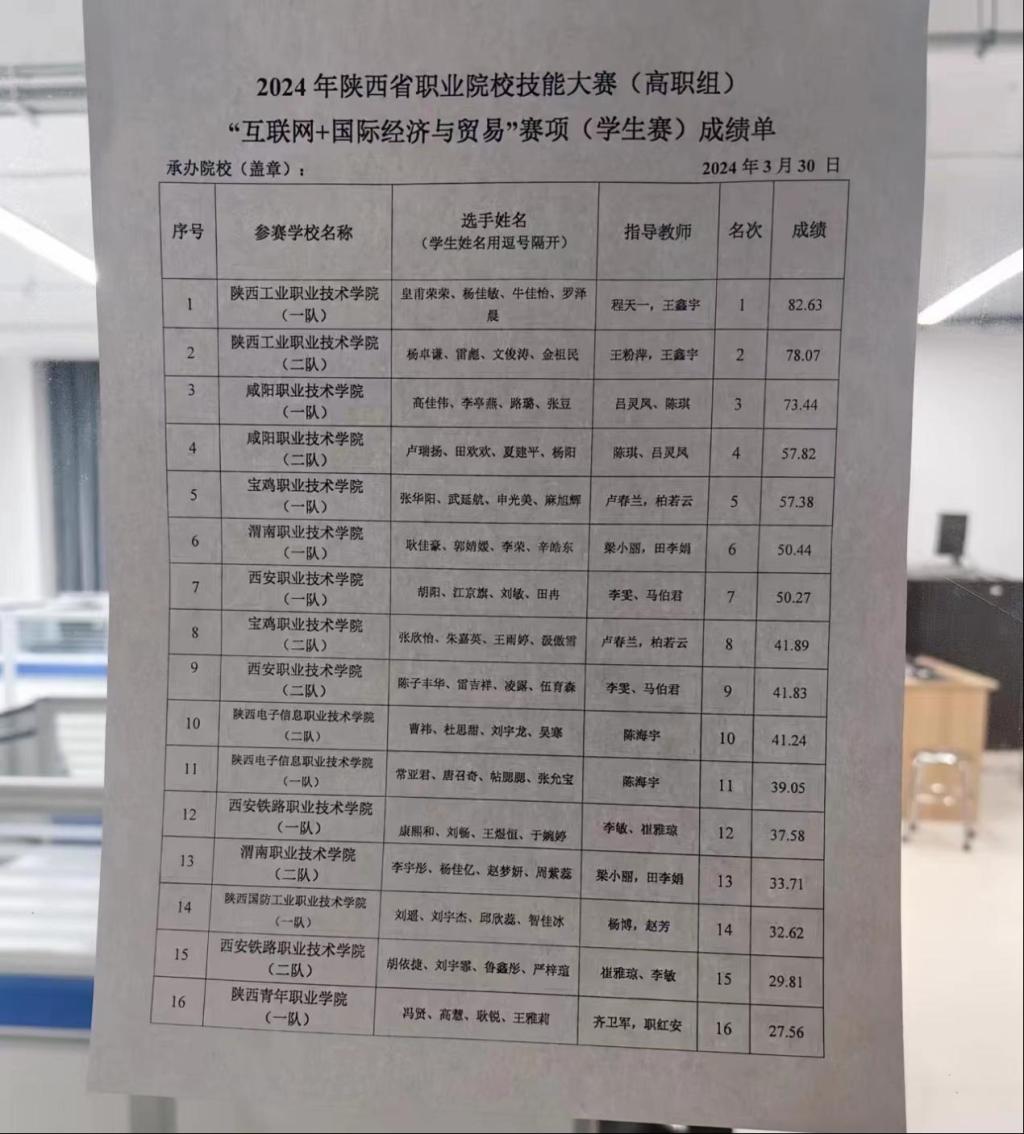 2024年3月29日至3月30日,陕西省职业院校技能竞赛“互联网+国际经济与贸易赛项”顺利落下帷幕,全省共有10所院校、19支代表队76名选手参与。商贸与流通学院共有两支参赛队伍,分别由王鑫宇、王粉萍、程天一老师指导。经过激烈角逐,由皇甫荣荣、杨佳敏、牛佳怡、罗泽晨4名同学组成的代表队获一等奖第一名,由杨卓谦、雷彪、文俊涛、金祖民4名同学组成的代表队获一等奖第二名。