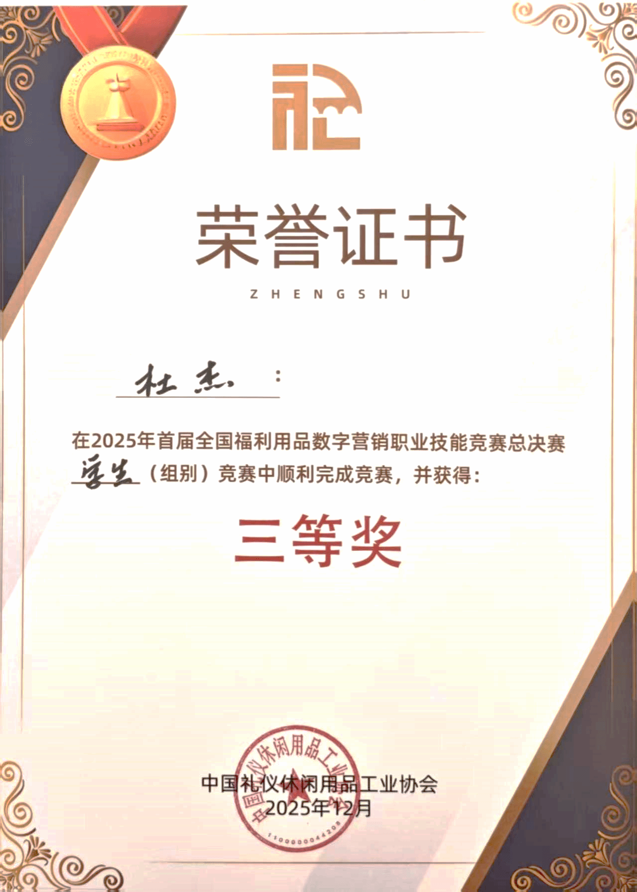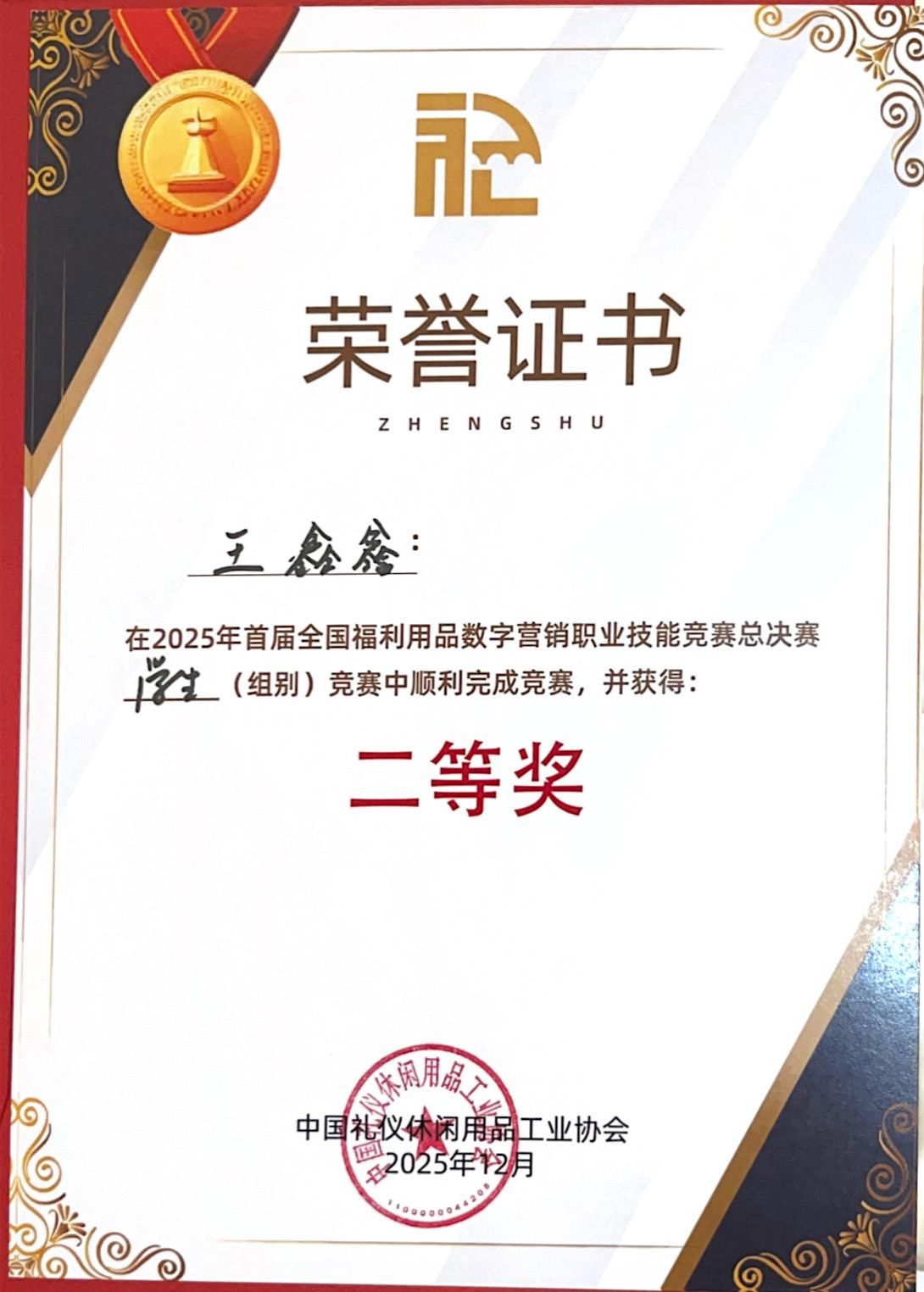 近日,首届全国福利品数字营销职业技能竞赛成功举办,本次技能大赛分为学生组和职工组,大赛内容涵盖视频剪辑、私域推文、总结优化分析等板块,重点考察学生对市场趋势推理以及数据分析的能力。商数教研室高度重视,安排刘瑞老师悉心指导,选派优秀同学参赛获得好成绩,我院商数2503班王鑫鑫荣获大赛二等奖,商数2501班郭婷蕊和商数2501班杜杰荣获大赛三等奖。